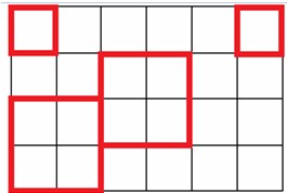 广场要求必须在这个矩形范围内,广场边线不能跨过任意一个单位正方形内部,只能与正方形边线重合,且广场必须为正方形。那么上图中,以下4种正方形均为可行方案: