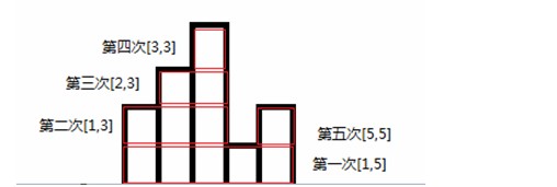 由于机器的特殊性,小明希望喷涂的次数尽量的少。如下图的围栏情况,共有5块木板,高度分别为2,3,4,1,2。第一次可以刷1~5,第二次刷1~3,第三次刷2~3,第四次刷3~3,第五次刷5~5。5次就可以刷完!(刷的顺序可以随意调整,也可以从上面开始刷)