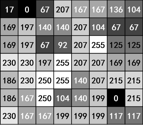一张黑白照片高度是m个像素,宽度是n个像素。我们可以用二维数组描述这个m*n的像素点阵。下面的例图是一个7*8的像素点阵,并标记了像素值。