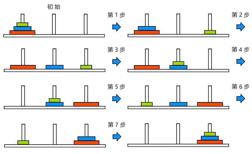 例如,当有三个圆盘时,其移动过程如下: